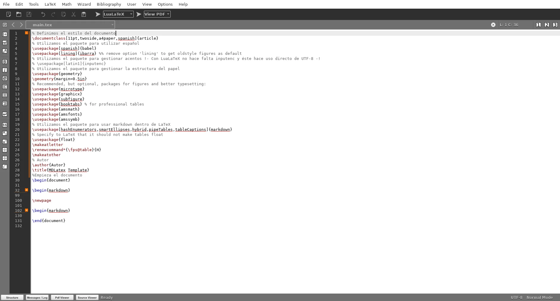 sudo apt-get install texmaker. - Creeu un document. En el meu cas, faig servir Markdown i LuaLaTeX com a compilador de PDF. Per a qui ho vulgui, aquí teniu la plantilla completa: